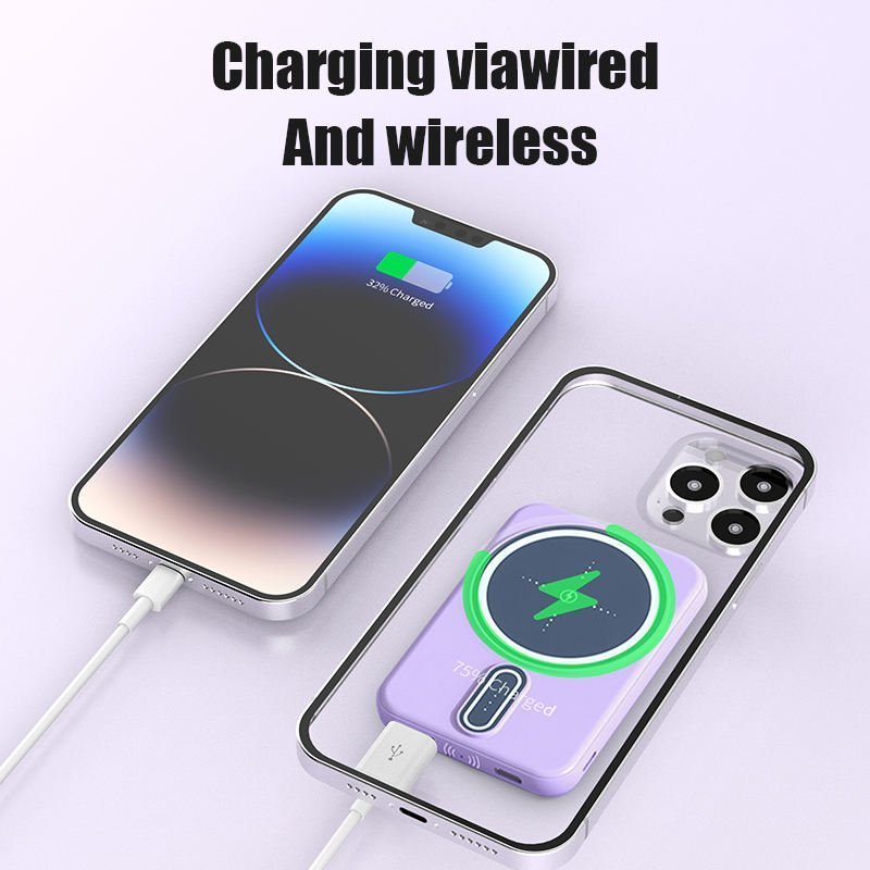 Designed in an elegant purple finish, this mini power bank combines appearance with functionality. Its wireless magnetic feature allows easy attachment to compatible smartphones for convenient cable-free charging. The compact size fits comfortably in your pocket or bag, making it ideal for on-the-go use.